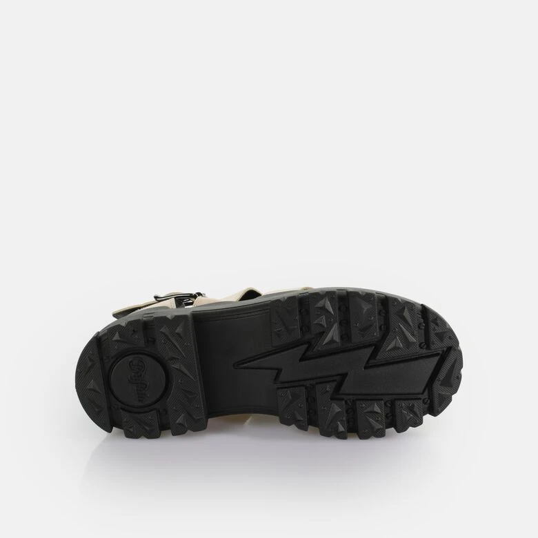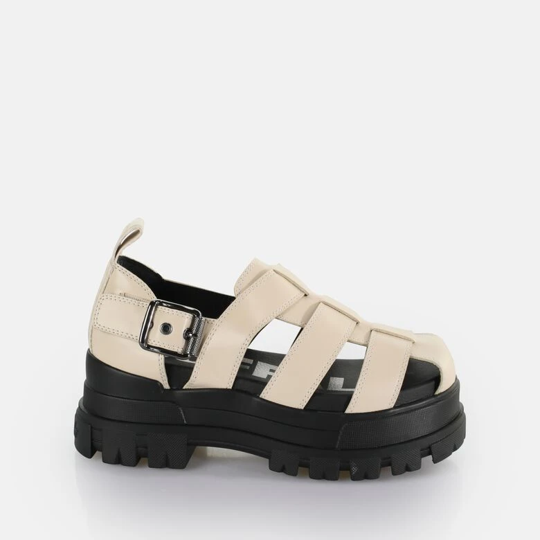 Eine Renaissance der klassischen Fischersandalen bietet die Aspha FSH Plateau-Sandale. Der Eindruck entsteht durch das Geflecht der breiten Riemen aus hochwertigem Polyurethan. Ein verstellbarer Fersenriemen mit Dornschließe sorgt für die optimale Passform. Das geringe Gewicht gewährleistet einen angenehmen Tragekomfort. Typisch für unsere Plateau-Sandalen ist die 6,5 Zentimeter dicke Chunky-Sohle. Bei der Aspha FSH Plateau-Sandale mit créme-farbigen Riemen sorgt eine schwarze Sohle für den perfekten Kontrast. Nicht zuletzt kommt in diesem Modell unser Engagement für das Tierwohl zum Ausdruck. Die Plateau-Sandale besteht vollständig aus veganen Elementen.