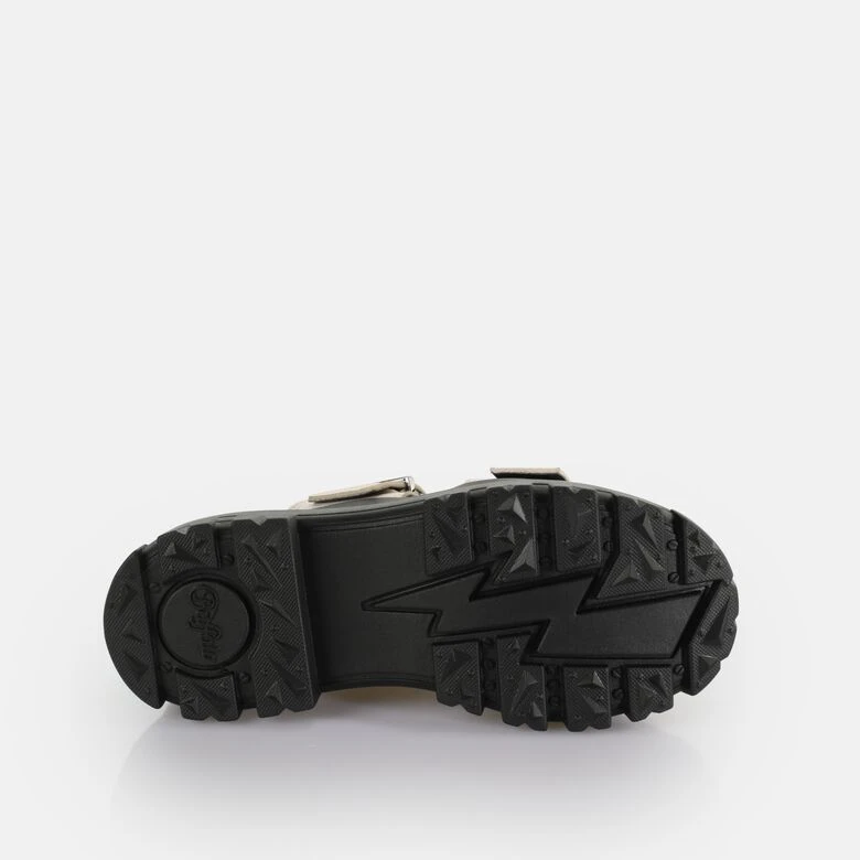 Bei der Aspha Loop Plateau-Sandale handelt es sich um eine Pantolette, in die Du einfach mit dem Fuß hineinschlüpfst. Dank seiner Leichtigkeit begleitet Dich der Schuh den ganzen Tag und ist dabei kaum spürbar. Doch das Design erregt Aufsehen. Die cremefarbigen Riemen treten aus einer schwarzen, 6,5 Zentimeter dicken Chunky-Sohle hervor. Große silberne Dornschließen und mit silbernem Metall umrandete Verschlussösen verleihen der Plateau-Sandale einen rockigen Anstrich. Übrigens: Wir produzieren diesen Schuh nur mit veganen Zusatzstoffen.