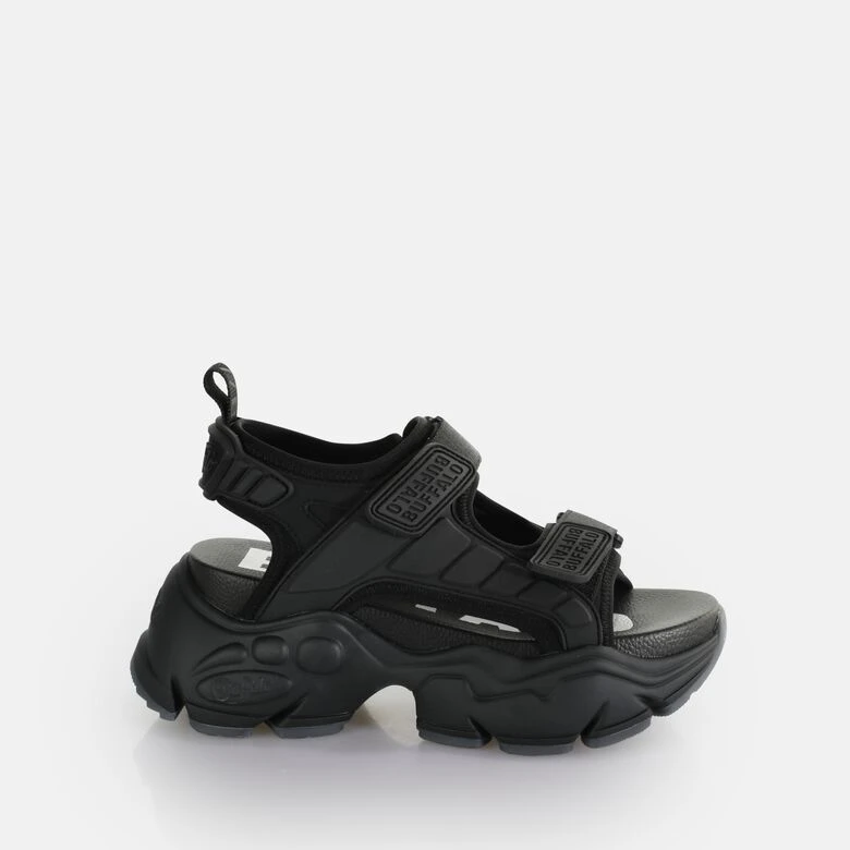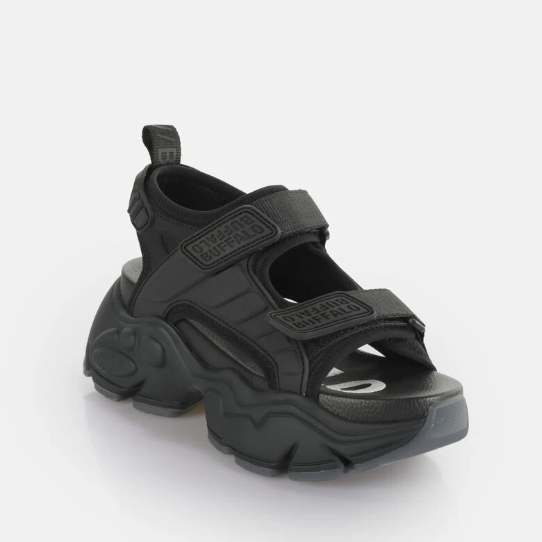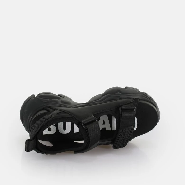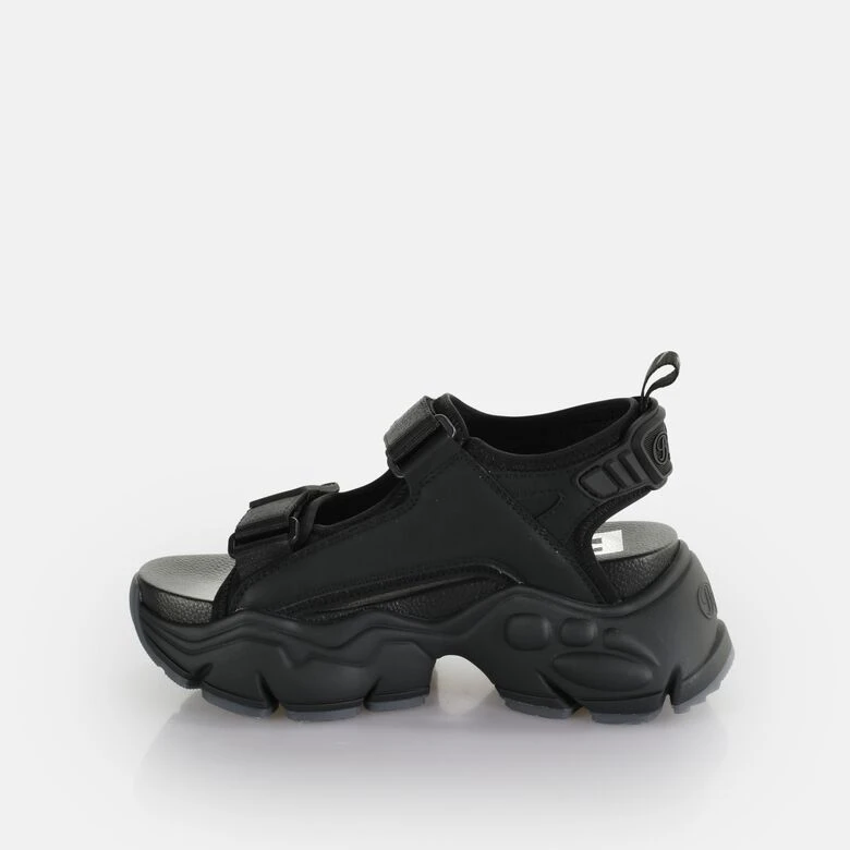 Perfekt für Deinen echten Killer-Look. Die schwarze Binary Track Plateau-Sandale zeigt sich in einem veganen Nappaleder und wird damit zum echten Eyecatcher. Das schwarze Upper sitzt auf einer chunky Plateausohle und macht optisch ordentlich was her. Dabei bieten die breiten Riemen dank der praktischen Klettverschlüsse eine optimale Passform. Die Sandale ist ultraleicht und lässt sich zu jedem extremen Look kombinieren.