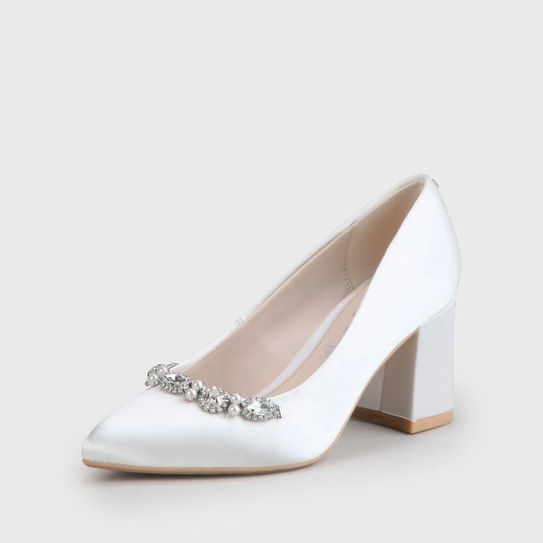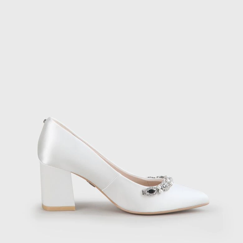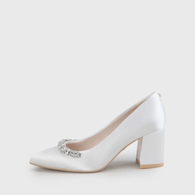 Zeitlose Eleganz für zeitlose Liebe: Mit seiner klassischen Form sowie dem bequemen Blockabsatz verleiht der Ester Pump der Braut in jeder Location atemberaubenden Glamour. Der schimmernde Satin in trendigem Elfenbein erhält durch funkelnde Kristalle und Perlen ein stylisches Upgrade.