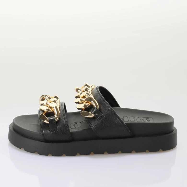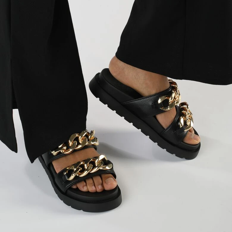 Du suchst nach einem neuen Highlight für den Sommer? Mit den Eve Loop Plateau Pool-Slides perfektionierst Du garantiert jeden Look. Ein schwarzes Design in veganem Material wird mit goldenen Chains in einen echten Eyecatcher verwandelt. Dabei sorgen die angenehme Leichtigkeit und die weiche Laufsohle für faszinierenden Tragekomfort. Kombiniere die Slides zu jedem Deiner Streetstyle-Looks.