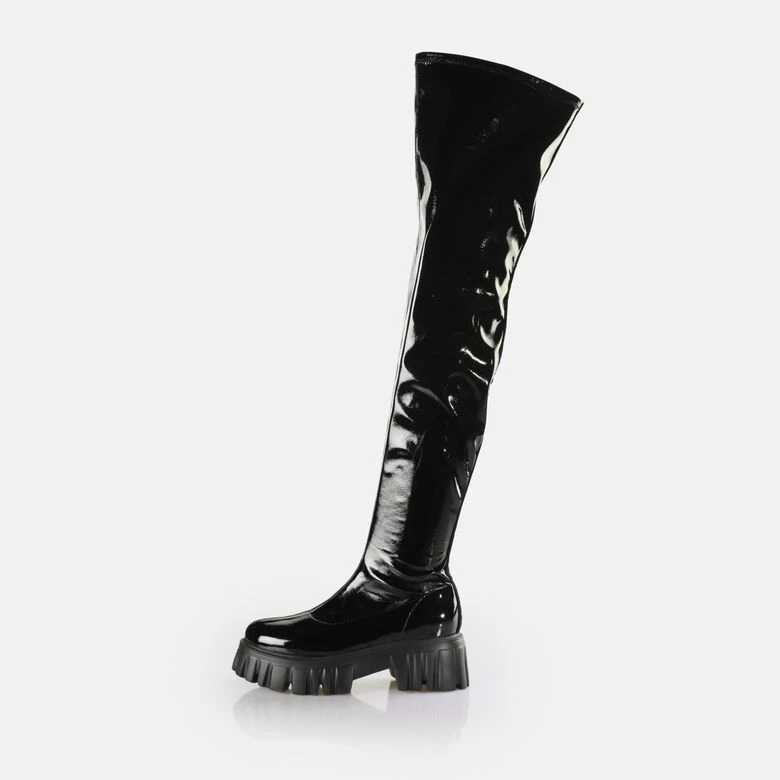 Schwarzer Lack ist das bestechende Design-Element dieses Overknees. Sein hoher, elastischer Schaft umhüllt Deine Beine mit seinem angenehm weichen und vollständig veganen Material. Einen reizvollen Kontrast zur glänzenden Oberfläche des Lion Over Boot bildet die hohe, robuste Sohle mit einem flachen Absatz. Dabei unterstreicht sie optisch die Länge Deiner Beine. Dieser angenehm leichte, mit einer Innensohle aus Memory Schaum ausgestattete Eyecatcher ist Dein aufsehenerregender Begleiter bei vielen Gelegenheiten!