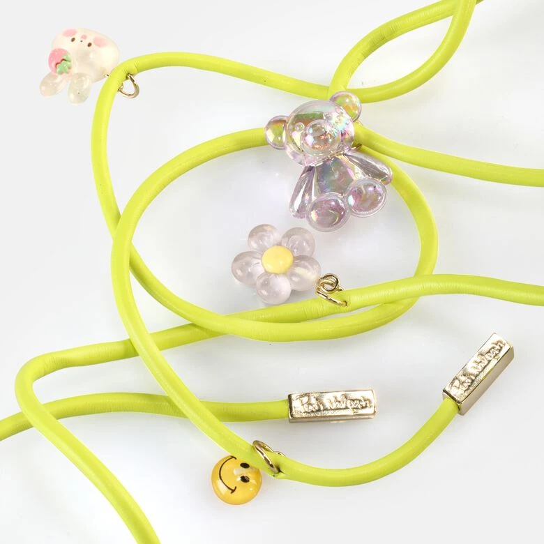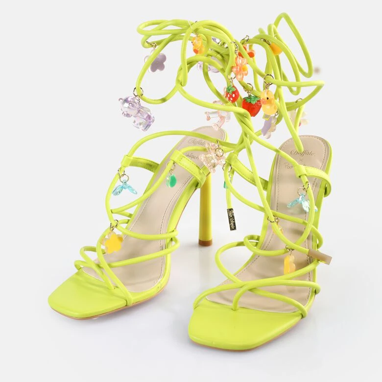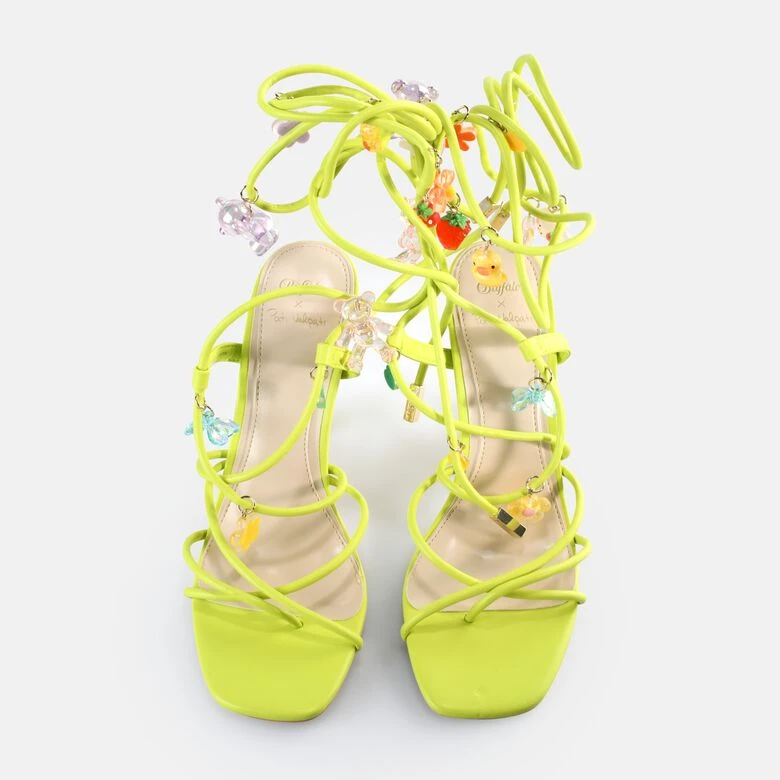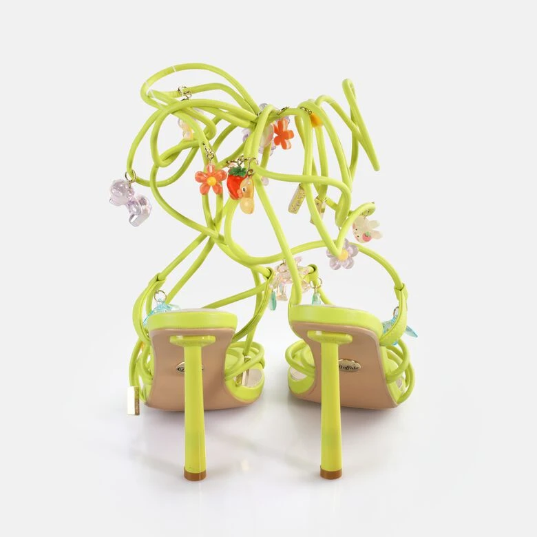 Das Mantra „No Highs without Lows“ überträgt PATI VALPATI sprichwörtlich in das Design ihres Heels „The High“. Der Heel repräsentiert mit Pfennigabsatz, neongrünen Riemen und vielen bunten Charms wie z.B. Teddybären, Erdbeeren und Blumen die 2000-Jahre-Ästhetik.